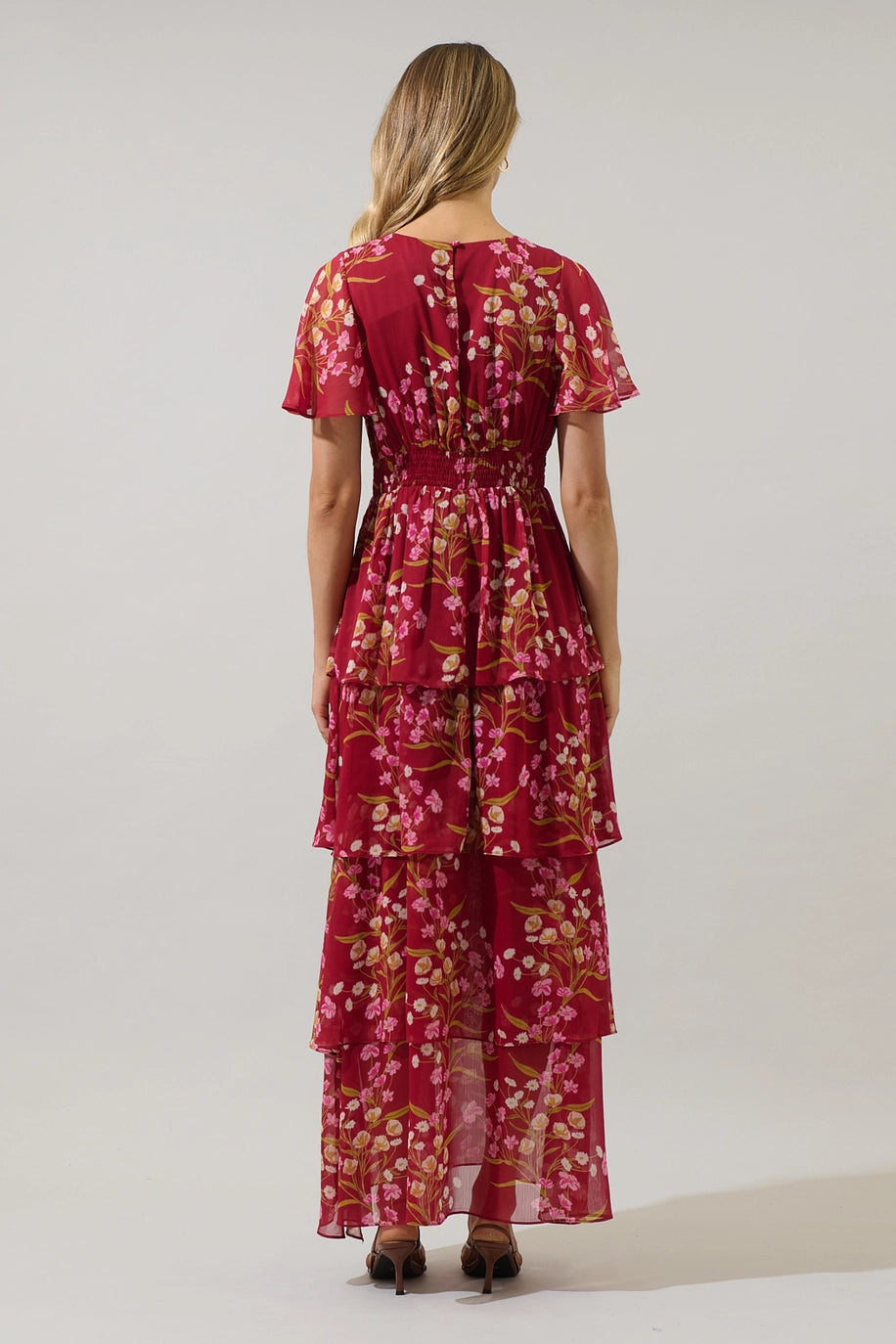 Twirl into effortless elegance with the Amabel Tiered Maxi Dress. This charming piece showcases a romantic floral pattern paired with a flattering deep v-neck and short sleeves for the perfect balance of coverage and allure. The tiered silhouette creates beautiful movement, while the smocked back ensures a comfortable, figure-hugging fit that moves with you. Whether you're heading to brunch or a garden party, this dress is your go-to for looking polished without trying too hard.