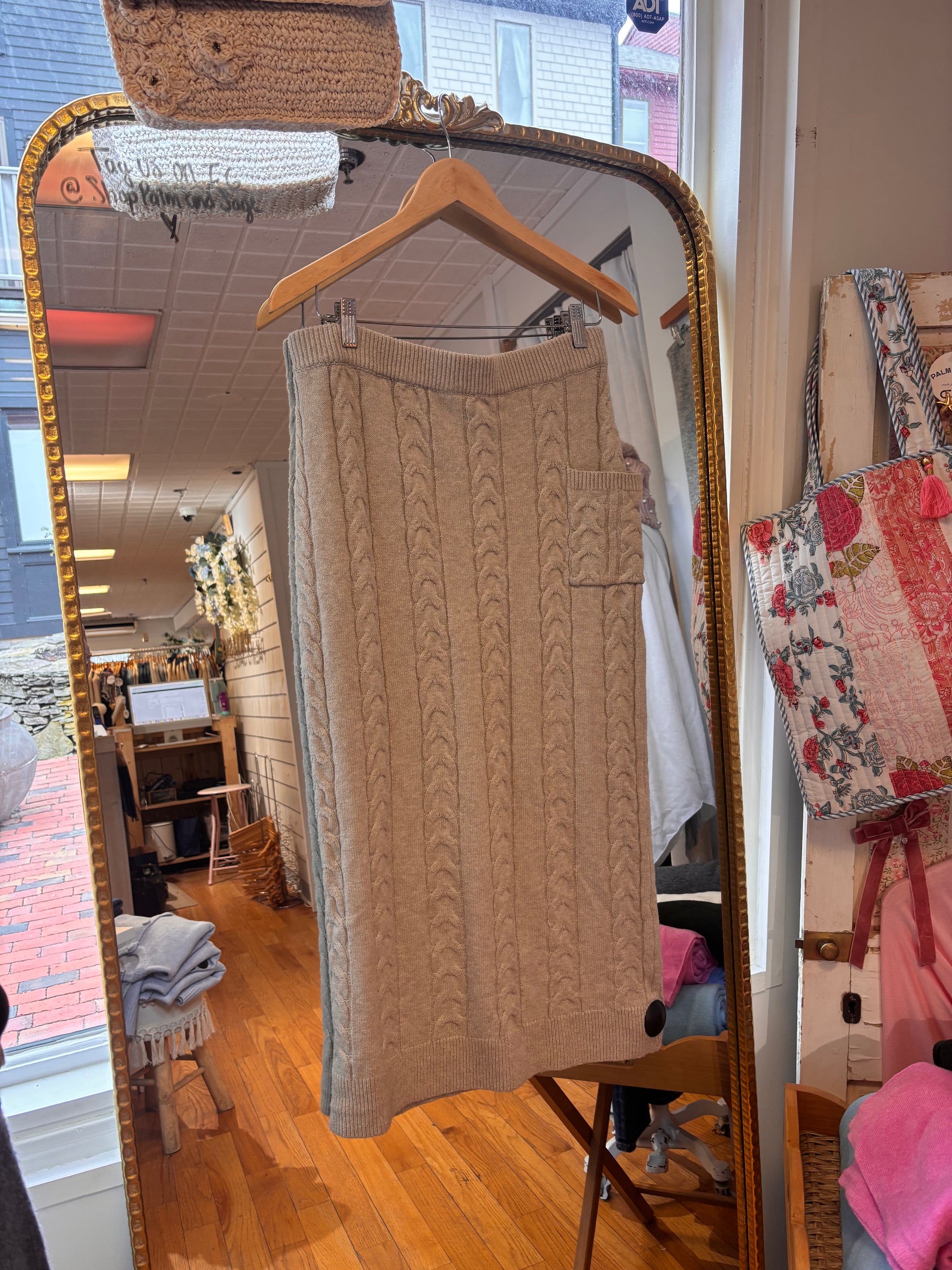 Cozy up in this charming cable knit midi skirt that brings sweater-style comfort to your everyday look. The soft grey knit hugs you in all the right ways, while the midi length keeps things effortlessly chic. Perfect for layering over tights or pairing with your favorite boots, this piece transitions seamlessly from casual coffee runs to weekend hangouts. It's the kind of skirt that feels like a warm hug—because who says comfort can't be stylish?