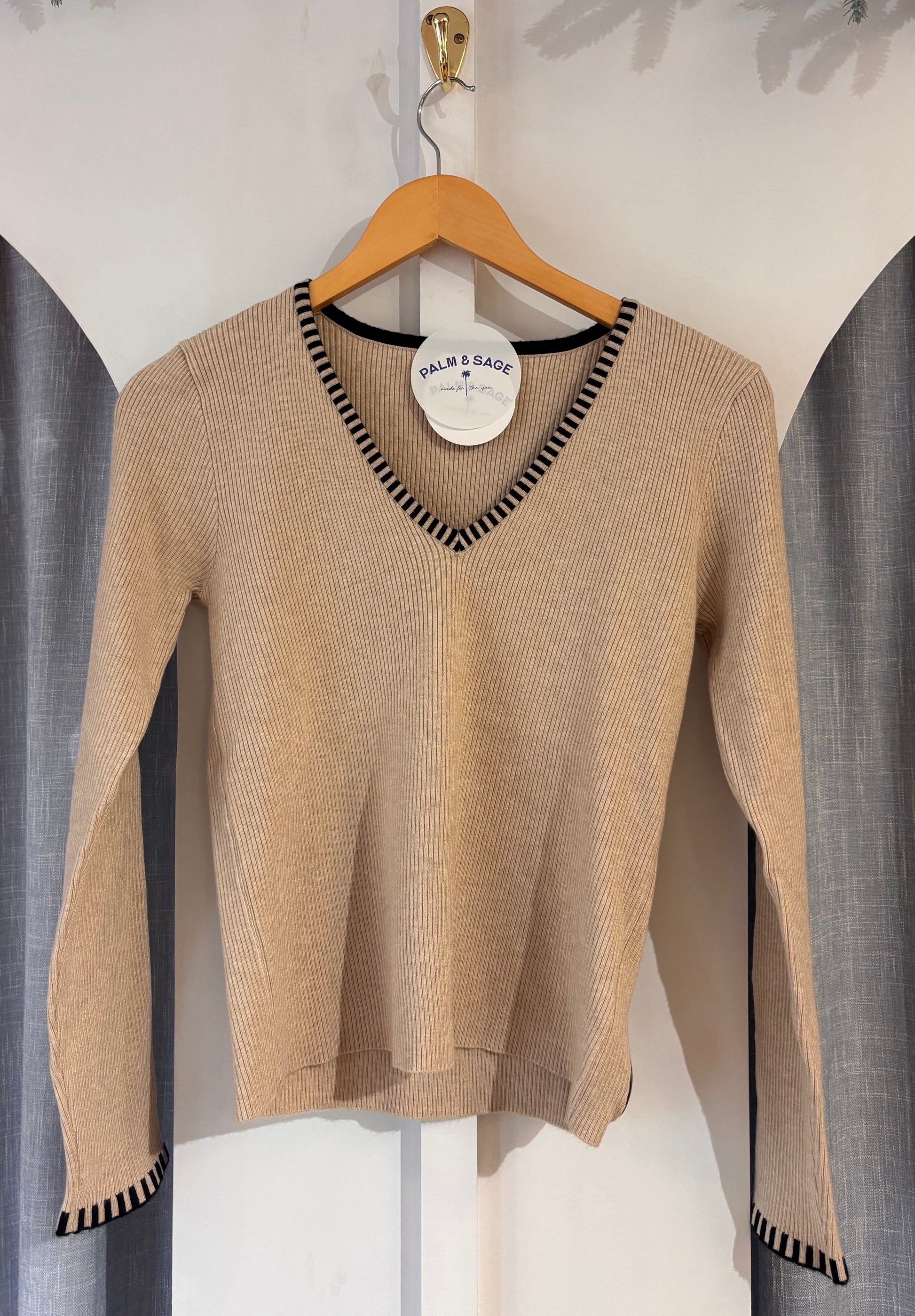 The Blake Sweater Top is your new wardrobe MVP. This lightweight ribbed beauty features sleek black accents at the neckline and cuffs for a touch of sophistication. Layer it, wear it solo, pair it with denim—honestly, it does it all. Cozy enough to keep you warm without weighing you down, this versatile essential is the piece you'll reach for again and again.