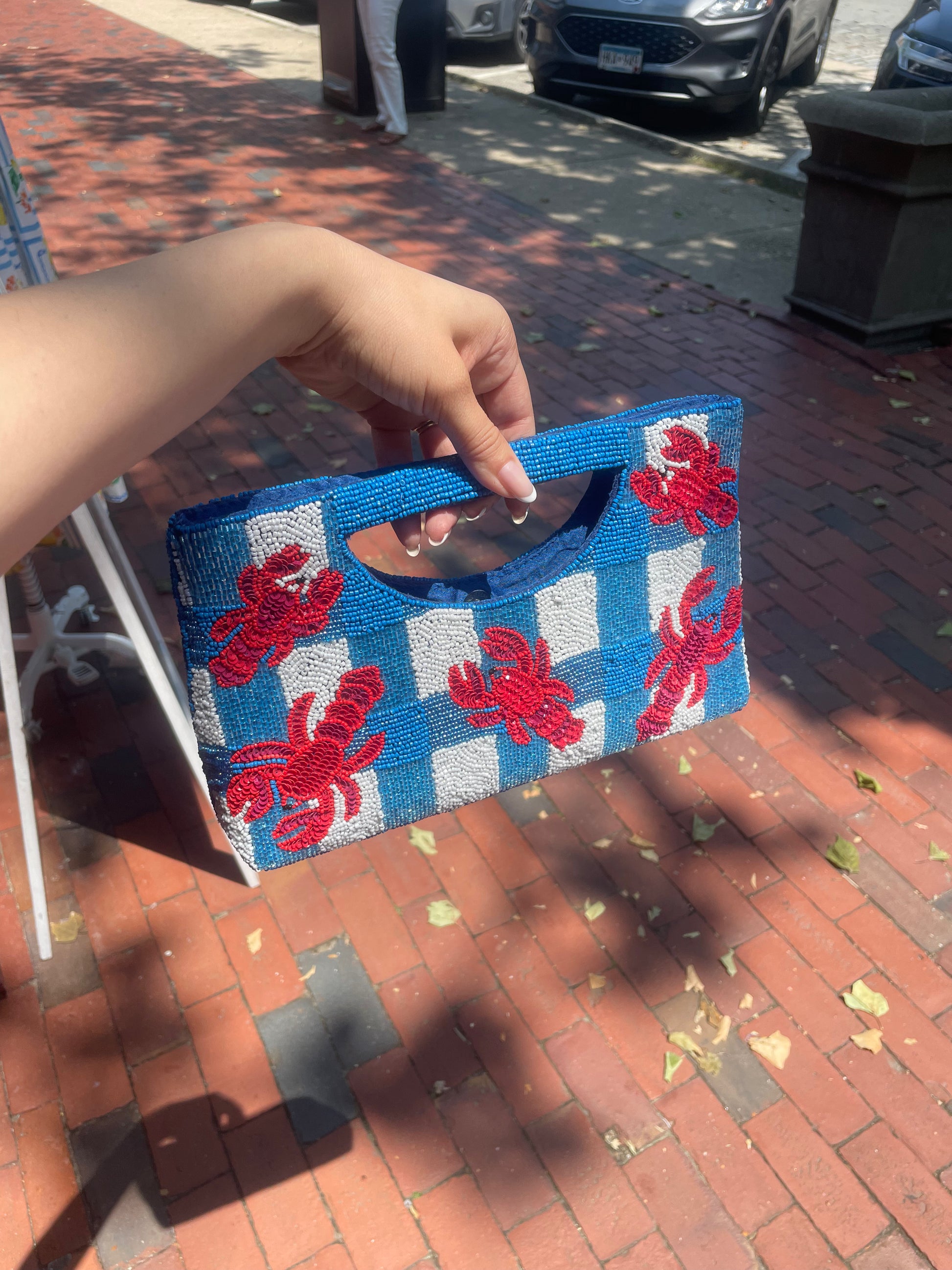 Add a splash of seaside charm with this playful Coastal Claw Beaded Clutch. Featuring a fun lobster design and a blue-and-white gingham pattern, it can be worn as a clutch or a crossbody for versatile style. Perfect for beach days or casual outings, it brings a whimsical touch to any outfit.