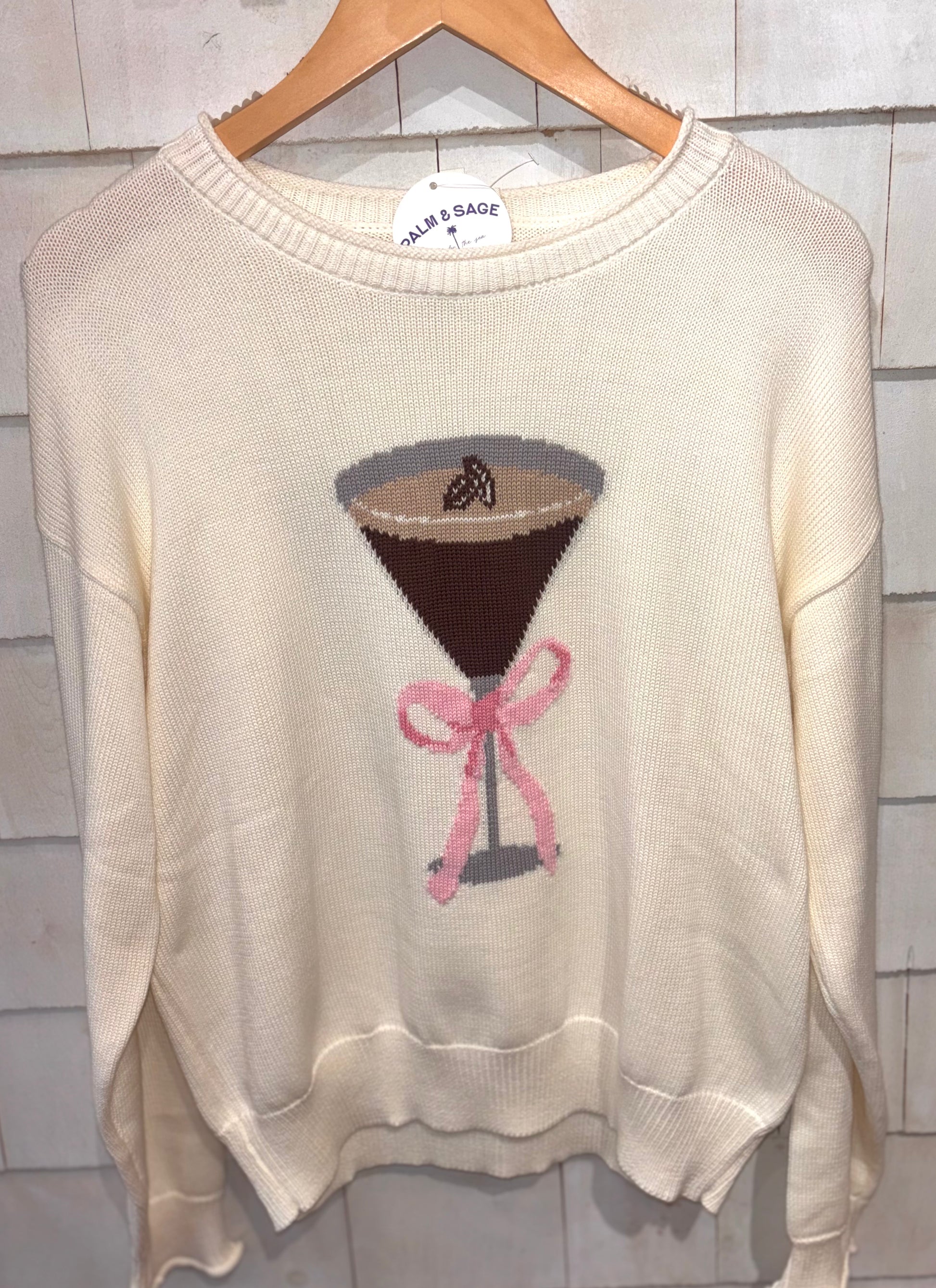 Get ready to turn heads in this irresistibly cute white knit sweater, complete with a show-stopping espresso martini graphic crowned with the sweetest pink bow. Cozy, girly, and unapologetically fun, this piece is your new favorite for any occasion. The plush knit fabric feels like a warm hug, while the playful cocktail design brings instant personality and charm. Whether you're celebrating with your girls or just embracing your fun side, this sweater is the perfect blend of comfort and style.