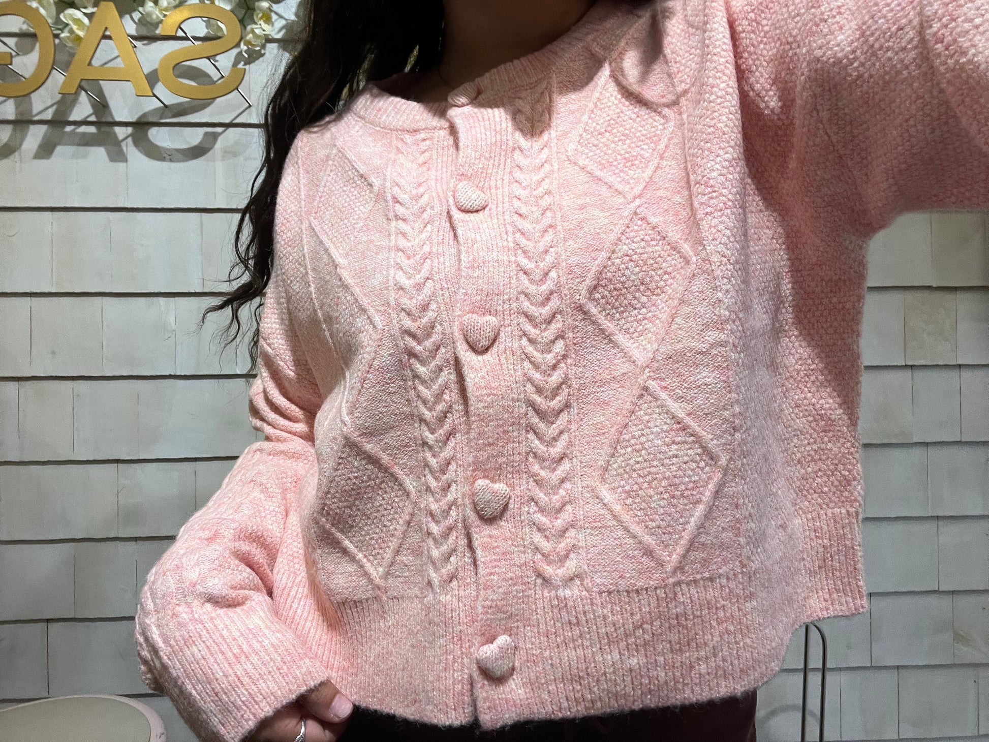 Fall in love with the My Valentine Cardigan, featuring adorable heart buttons and charming textured details. Its soft pink color adds a sweet and playful vibe, making it the perfect cozy companion for every day you want to feel extra special.