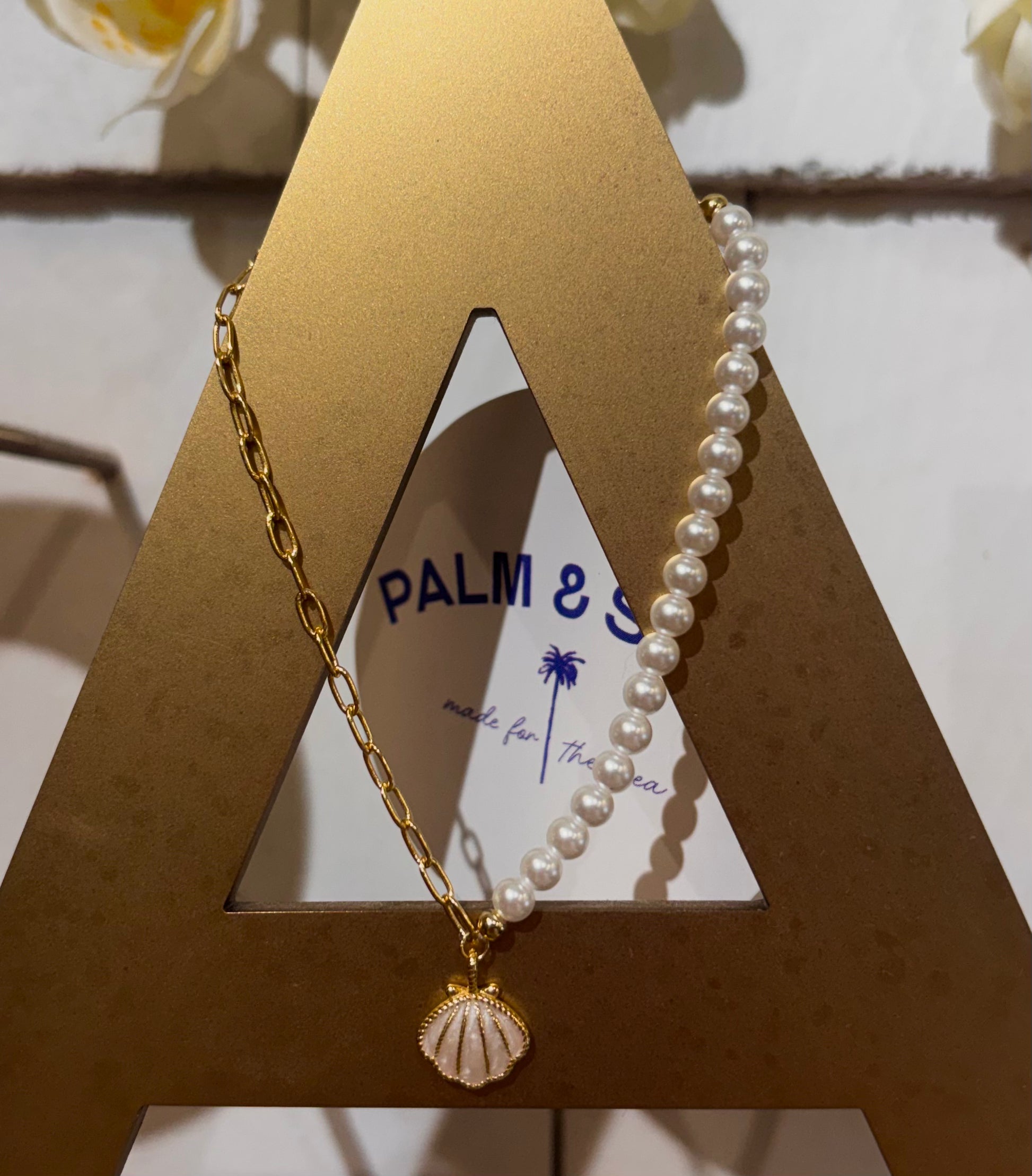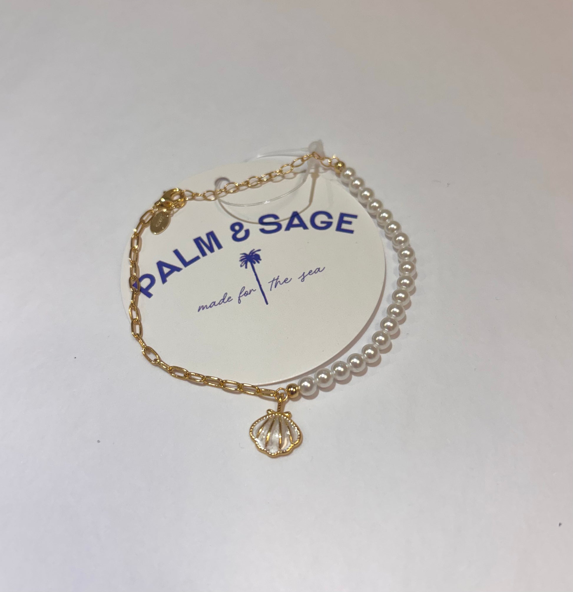 Delicate elegance meets beachy vibes with this charming bracelet! Half shimmering gold chain flows seamlessly into lustrous pearl beads, creating a perfectly balanced design. A sweet shell charm dangles from the center, adding just the right touch of coastal charm. Layer it with your favorites or let it shine solo—either way, you've got a piece that whispers sophistication with a playful wink.